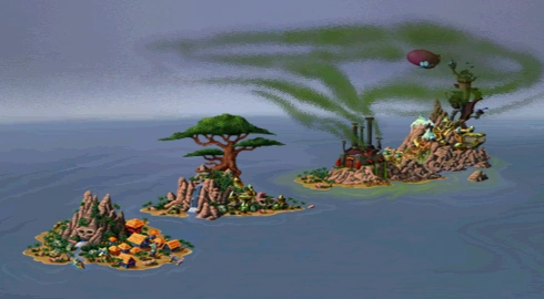 Pelin prototyyppiversiossa käytetty kaksiulotteinen karttanäkymä, jossa pelin kaikki kolme saarta näkyvillä samanaikaisesti.
